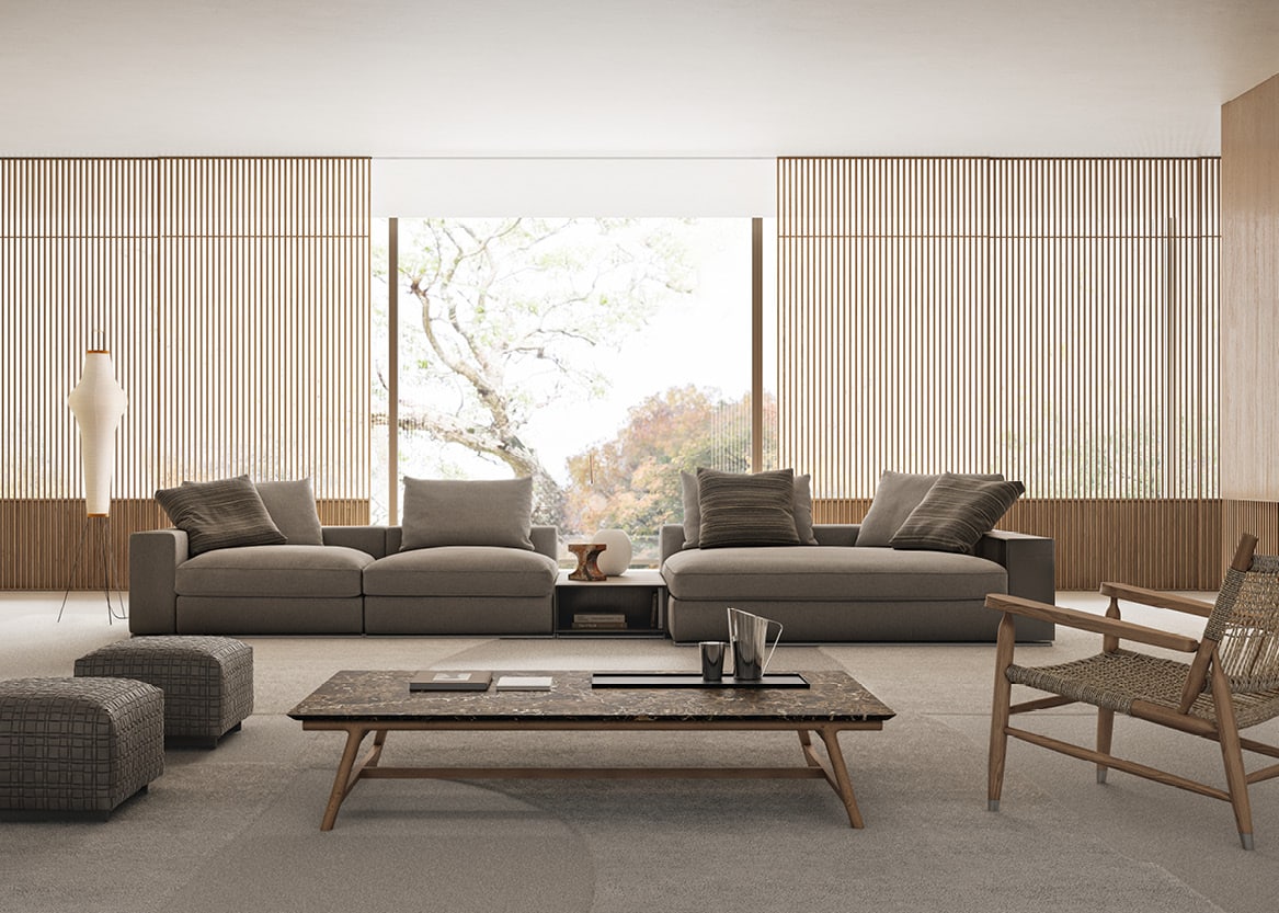 Groundpiece ist ein ikonisches Sofamodell mit schlichter, kompakter Struktur und hohem Sitzkomfort, das seit 2001 ein Bestseller ist. Antonio Citterio schuf dieses Design als Meilenstein für Flexform und betont natürliche Materialien sowie langlebige Ästhetik. Er integriert ergonomische Prinzipien, die Entspannung und zeitlose Modernität vereinen.
